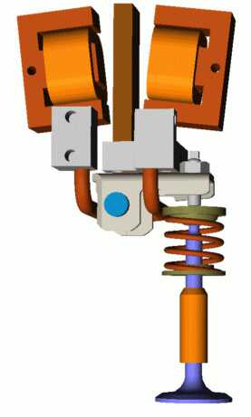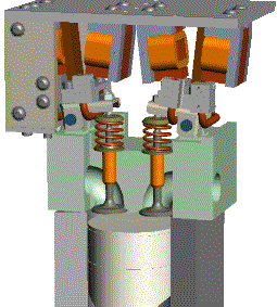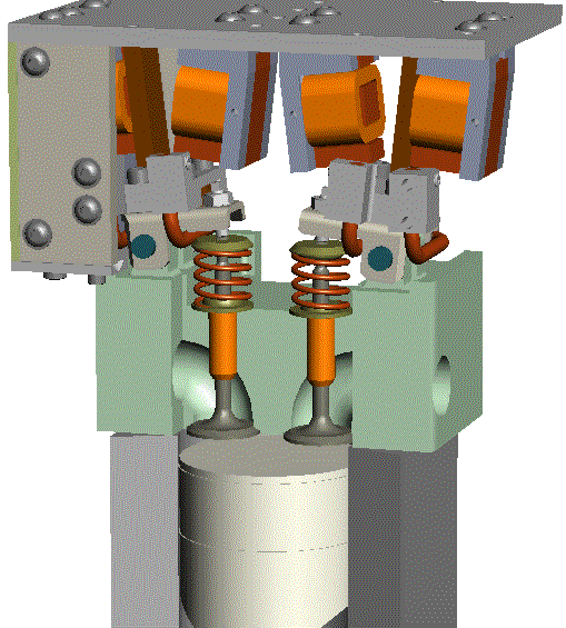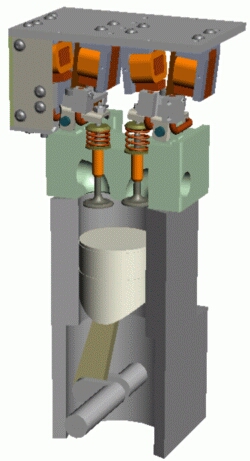 The valves and actuators are seen in the context of the cylinder and piston below. An animation of the valves and piston head is provided in low and high bandwidths.